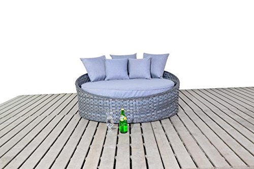 PRODUCT DESCRIPTIONS:You can see our full range of Rattan Garden Furniture at the best prices on out website www.cheapgardenchairs.com The Platinum Rattan Garden Furniture Small Daybed includes a circular bed with a thick base cushion and matching scatter cushions for added comfort. The Platinum range is constructed using a brushed finish grey poly rattan weave with feature highlights and alloy framework. It is also finished with luxury heavy weight grey cushions and adjustable leveling feet. The frame features our latest v2.0 zinc powdercoat rustproof coating for extra weatherproof durability. Â