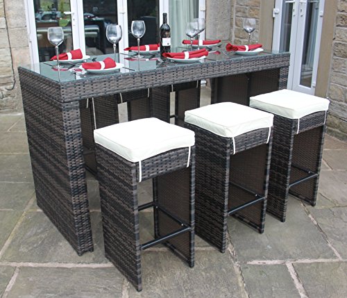 PRODUCT DESCRIPTIONS:Every garden needs a feature and this Curieuse Rattan Bistro Bar Set could be just the trick. Including a large 180cm long bar table and high stools upon which to relax upon you'll have friends and family always wanting to come round your home this summer. The high bar stools are very comfortable without the need for a cushion which makes them perfect for use as a commercial rattan bar stool set or simply at home in the garden. If you have any questions regarding this Curieuse Rattan Bistro Bar Set our team are on hand to assist so please do get in touch. Limitless Base bringing Seychelles islands Luxury Furniture to your home for a fraction of the price.