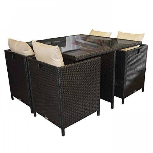 PRODUCT DESCRIPTIONS:Enjoy warm summer evenings outdoors with this 4 Seater Cube Furniture Set. This stylish dining set will compliment any garden and includes a square table, 4 chairs and 4 thick cushions for additional comfort. The compact set can be neatly stored as the chairs tuck underneath the table for those who lack space. Made of a weather resistant durable PE weave, this furniture set is great when entertaining family and friends.