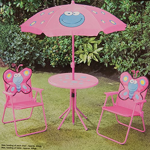 PRODUCT DESCRIPTIONS:Let your little ones enjoy summer lunches in the garden with this colourful patio furniture set. Set comes complete with 2 comfy folding chairs, 1 round table and a parasol to help shade them from the hot sun. Available in Pink Butterfly or Red Ladybird designs. Specifications: 1 x Table (50cm diameter) 2 x Chairs (75cm Height) 1 x Parasol (100cm diameter) Max Load of each chair: Approx 30kg Max Load of table: Approx 30kg Product not suitable for children under 3 years - small parts. Must be used under adult supervision. Adult assembly required.