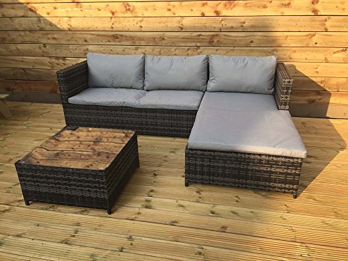 PRODUCT DESCRIPTIONS:Relax with friends and family this summer with this stylish and comfortable three piece garden corner sofa set. The sofa unit has deep fill seat and backrest cushions to provide comfort, and the chaise lounge unit has comfortable cushions allowing you to lay back and stretch out. This set also comes with a matching glass topped coffee table enabling you to put your bottle of wine and beers near you, as well as some snacks. This is a great way to entertain in comfort and not only would it look good in your garden but this would make ideal conservatory furniture. Set includes: 1 x 2 seater sofa (H62cm x W137cm x D69cm) 1 x Corner lounger (H62cm x W145cm x D75cm) 1 x Square glass topped coffee table (H32cm x W60cm x D60cm) 2 x Padded seat cushions 3 x Scatter cushions Please Note: colour may vary slightly from pictures Delivery: This item will be sent out on a pallet due to the size and weight. The postage shown is for UK mainland only and excludes Scottish Highlands & Islands and Northern Ireland. Please message or call us for a postage quote.
