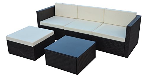 PRODUCT DESCRIPTIONS:A very elegant, modern and luxurious Polyrattan Garden Funiture.Handmade,with maximum comfort. Placed consists of a very stable, powder-coated metal. The poly rattan wicker: The elaborate winding is made by hand High quality wicker furniture, color: Brown UV resistant wicker according to ISO 4892-2 Also under the influence of strong sunlight absolutely no change in the material. Dirt repellent, easy to clean. The pillows: Extra thick seat cushions, weather resistant cushions ensure lasting comfort (liquid-repellent) With concealed zipper, pillow covers are washable, easy to care. In this offer, all mapped water resistant cushions in beige color are included. Scope of delivery: 2 x corner sofa 76x76x64,5 cm (LxWxH) 1 x center sofa 67x76x64,5 cm (LxWxH) 1 x stool 67x67x32, 5 (LxWxH) 1 x table 67x67x33cm (LxWxH) Including 5mm glass Seat height without cushion 32.5 cm Seat height with cushion ca.40, 5cm seat 67x67cm (W x L) Material: Poly Rattan Color: Brown Includes seat and back cushions Delivery disassembled. The kit must be installed.
